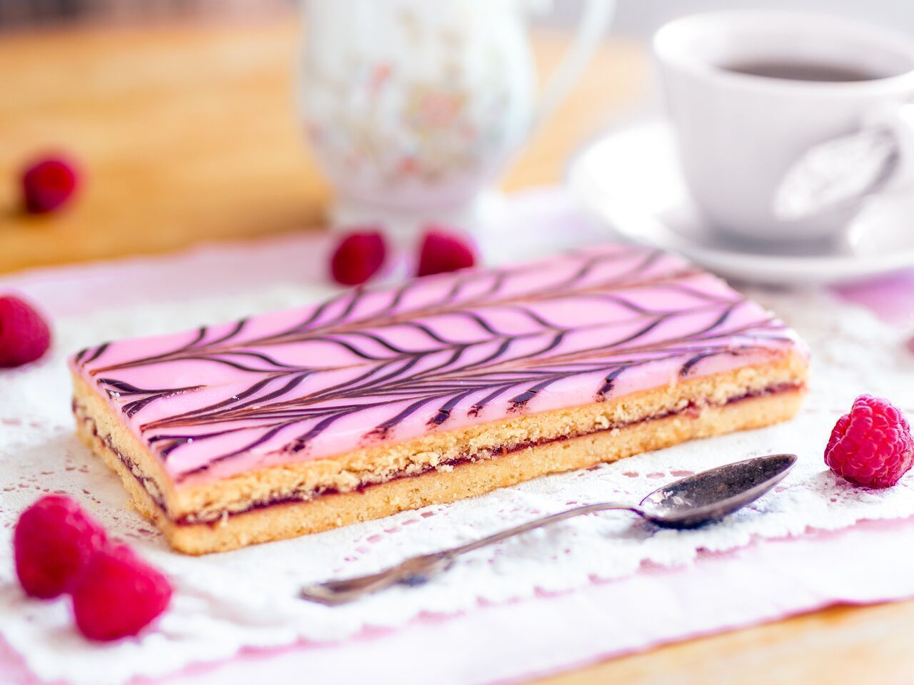 Ainesosat: VEHNÄjauho, VOI ((pastöroitu KERMA, suola, hapate)), sokeri, KANANMUNA, leivinjauhe, vadelmamarmeladi ((sokeri, vadelma (30 %), vesi, sakeuttamisaine (E440), muunnettu maissitärkkelys, happamuudensäätöaineet (E330, E333), säilöntäaine (E211), väri (E163)), sokerikuorrute ((sokeri, glukoosisiirappi, vesi)), kuorrutussuklaa ((sokeri, kokonaan kovetetut kasvirasvat (palmuydin), kaakaojauhe (16%), emulgointiaine (auringonkukkalesitiini), luontainen vanilja-aromi)), väri (E120).